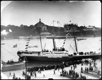 Skeppsbrokajen och fartyget ""Westerbotten"" under kejsar Vilhelm II:s besök. I bakgrunden Skeppsholmen