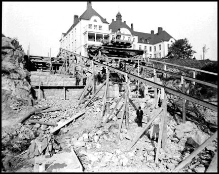Klippgatan, nuvarande Lilla Erstagatan: trappan upp från Folkungagatan under byggnad, transportsystem för uppforsling av stenblock. I bakgrunden Ersta Sjukhus