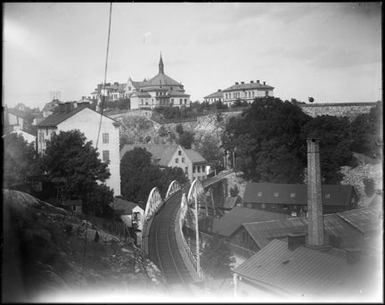Erstaklippan med kapellet från Åsöberget. I förgrunden Saltsjöbanans räls